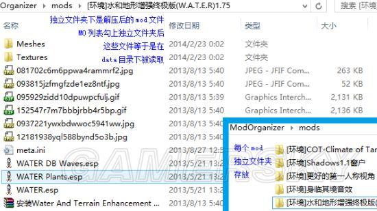 ④ModOrganizermods-----------每个子目录都是③。新建文件夹把mod放里面,打开MO会在列表下面出现。勾上就等于在③了。