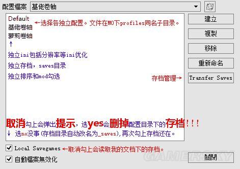 存档等配置文件都在MO目录下。——换电脑换系统重装游戏我的文档不见了都没影响,硬盘有原版游戏在,直接打开MO就读档继续游戏。
