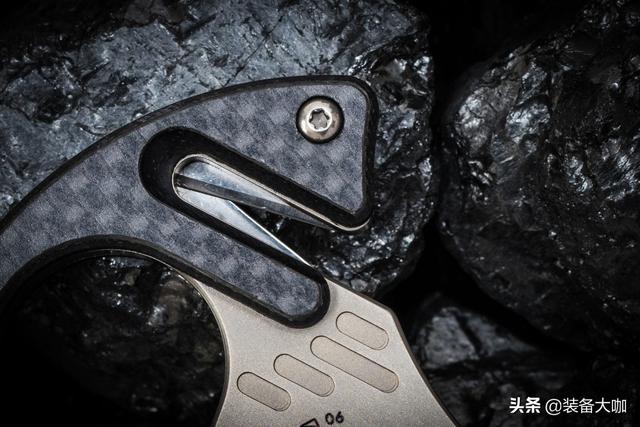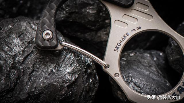 除了钛合金的结构材料以外,柄材的选取也是很高端,为了提供更好的抓握感,三刃木为SK046添加了一个碳纤维材质的握柄。碳纤维指的是碳纤维层压板,我们可以在很多高端的刀具中看到它的身影,它是将树脂采用层压技术加工后形成的一种材料,作为一种高端材料,碳纤维和钛合金同样拥有轻量化以及强度高的优势,同时碳纤维可塑性强且柔韧性高的特点,常被用于高端EDC装备的柄材的选取之上。