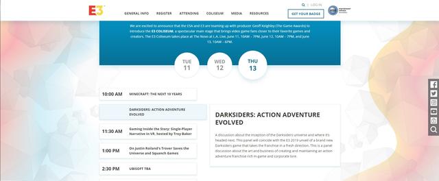 如上图, 这是E3 Coliseum 2019官网的截图,其中在“暗黑血统:动作冒险进化(DARKSIDERS: ACTION ADVENTURE EVOLVED)”的描述中有提到THQ将在今年E3上公布一个新的《暗黑血统》游戏,将系列带到一个全新的方向。