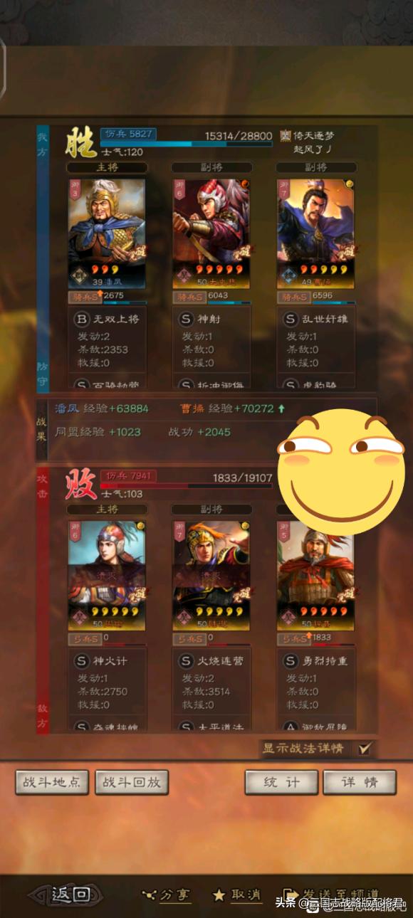桃园枪想克制一波骑兵,结果险胜一波,潘凤战损不高,全靠戏精关羽的表演。