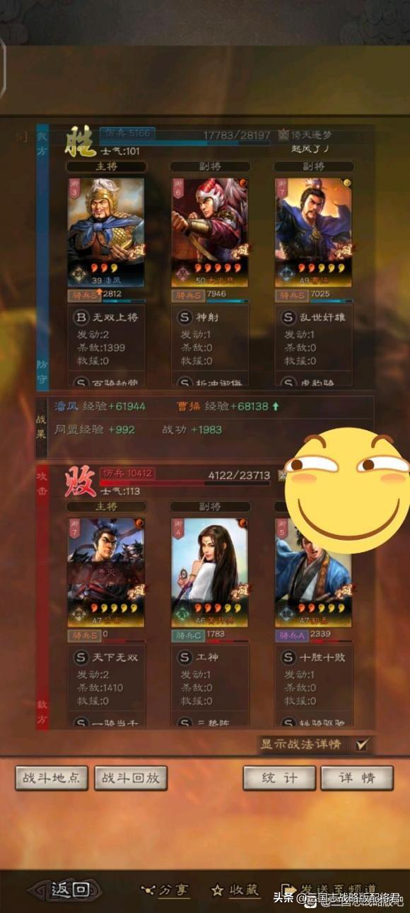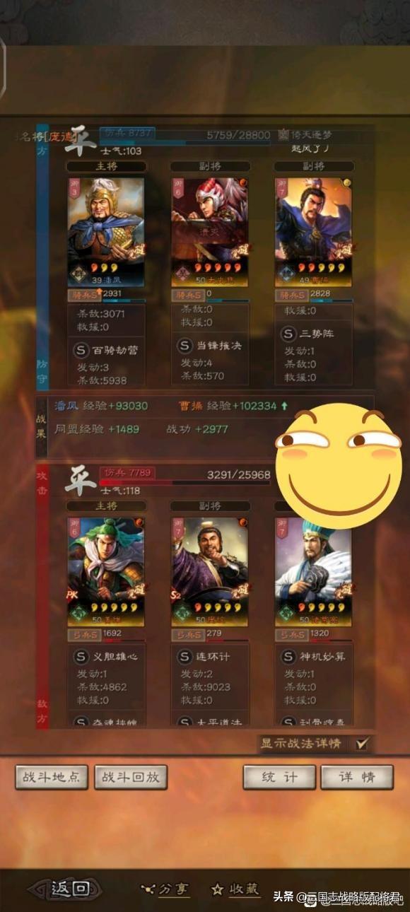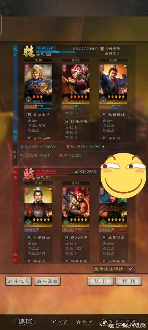总结:在以往的玩法里,大多数各种带所向披靡的玩法为主,就是想打一波破阵的暴力效果!本次的虎豹骑可谓是剑走偏锋,把太史慈和曹操两大神将都给安排上,最终在不遇到盛气凌敌队伍的情况下,打出来的战绩已经算是比较出彩了!只不过三星潘凤,居然没有满红,这个有点在搞他呀!目前潘凤这个武将在游戏中有点类似于“网红武将”,各种被人当玩笑开,三星也不指望加强了,什么时候策划可以出个五星SP潘凤,属性战法稍微提升一波,其实可玩性还是存在的,并且抽他的玩家应该不会少!