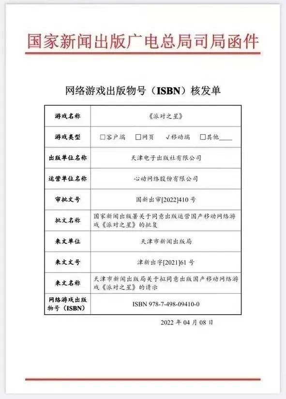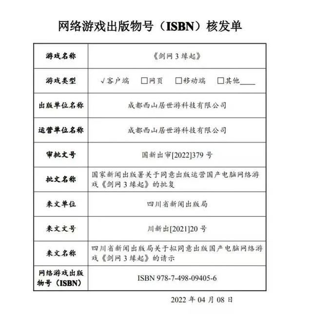 游戏联合体表示,从三方信源得到的一张《剑网3缘起》网络游戏出版物号(ISBN)核发单,其批文名称为“国家新闻邮品版署关于同意出版运营国产电脑网络游戏《剑网3缘起》的批复”。而落款日期为4月8日。除这张核发单之外,也看到了多个作品获得核发,其中包括心动的《派对之星》。