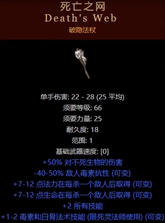 击杀怪物后能回血回蓝能让毒系玩法群刷时不愁续航,+2所有技能和+2死灵法师毒素技能和白骨法术使其成为毒系死灵法师首选,另外也可以作为毒狼玩法的武器。