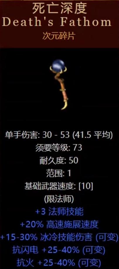 同样的,死亡深度的冰伤的变量范围是从15%到到30%,高变量属性极其难得。+3技能等级、施法速度、抗电抗火同样是实用性很强的属性。
