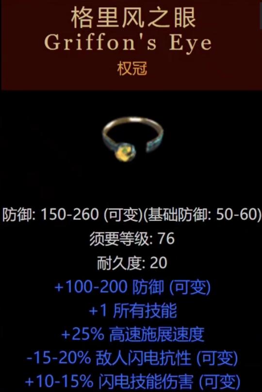 大名鼎鼎的全冠,俗称“电头”。虽然是头盔,但属性却非常实用地增加攻击力,最高降低敌人20%电抗性以及提升15%的电伤害,类似于死亡深度,成为电法和标枪亚马逊的毕业装备。