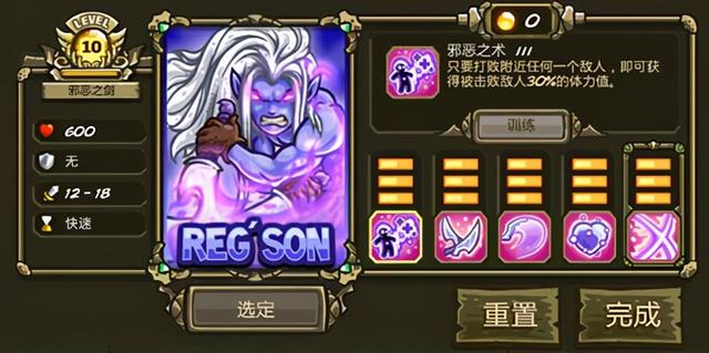 第二个女英雄,据说是粉丝投票选出来的,看技能相当屌,30概率秒杀,加防,270伤害aoe,30概率马上复活,1600伤害aoe大招。造型酷毙了,大镰刀应该是杀怪利器。技能伤害在所有英雄中是属于顶级水准的,不过我亲测过她和小精灵卡莎普攻对比,比小精灵伤害高一点点而已,和其他英雄没法比,攻速应该比小精灵慢一些。得益于她的技能伤害高,而普攻拉低了他的总输出,总输出在所有英雄中并不突出,感觉和游侠一个档次。普攻攻速不快,中游水准,能打空中目标,伤害忒低,远战是丢手帕,近战是挥镰刀,技能又是挥镰刀,有时候怪就在边上,不去挥砍,跑去丢手帕,第二下才想起来去挥砍,实在无语的设计。满级血量少,中甲,有个技能可以加防御,可惜这货基本很难吸到精英怪的灵魂,扛不住精英怪几下。定位非常不清晰,战士?防差点,血太少。法师?就一个丢手帕的普攻,伤害还低。实在尴尬。不过操作难简单,救场性也一般。总的来说这是个失败的英雄,基本没亮点,定位模糊,可玩性较差,不推荐。实用评分我给4.486.邪恶之剑-雷吉森