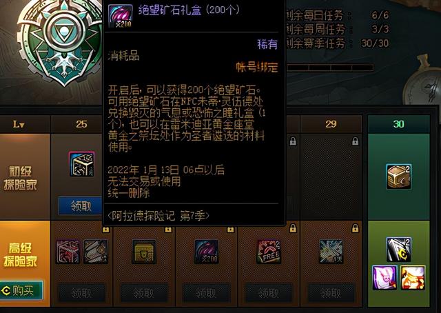 在阿拉德探险记升级的过程中,有不少的绝望矿石礼盒(200个)可以获得,还没有购买高级探险家的勇士们可以考虑,战令是游戏中性价比非常高的道具,当然也要注意自己是否能做活动结束获得全部奖励。