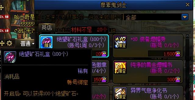 勇士们参与活动“像素勇士传说”获得的“像素碎片”可以在NPC像素鬼剑士商店出兑换绝望矿石礼盒(100个),每周兑换3次。