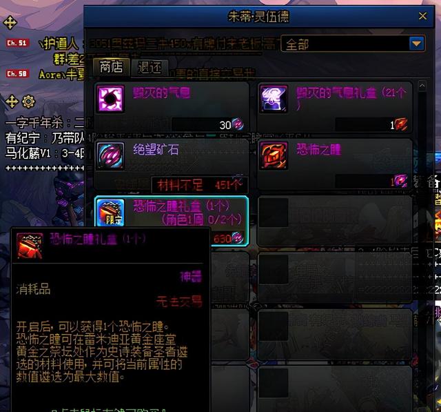 每周在NPC朱蒂·灵伍德商店可以使用绝望矿石兑换“恐怖之瞳礼盒”,一个角色兑换两次,这也是一条稳定最大值遴选的毕业途径。
