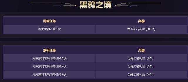 每周通关周常副本,会获得更多的绝望矿石,获得恐怖之瞳的概率也更高,同时3阶段和4阶段难度有概率获得可交易的绝望矿石礼盒,可以作为一个不错的摸金手段。