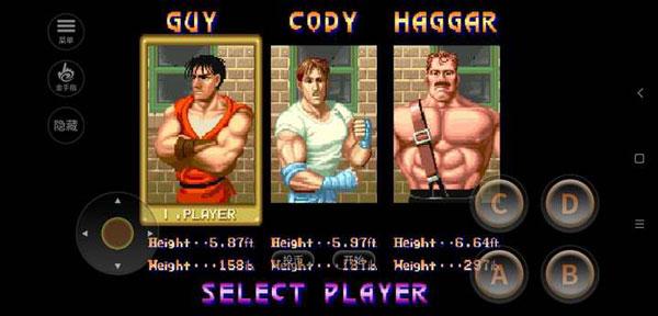 游戏中共有三位角色,分别为白色的科迪、红色的凯以及大力士哈格,除了通用技能外,还有各自的特色技能。通用技能 必杀:J+K摔投:攻击敌人时按住↑不放或者抓住敌人时按↑+拳膝盖压:空中↓+拳科迪 气功波:↓↘→+拳(四级才能使用)超级升龙拳:→↑+拳连续技1:空中↓+腿(接)连拳×3(接)抓住敌人(接)膝盖撞×3(接)背投连续技2:空中↓+腿(接)连拳×3(接)超级升龙拳凯 霹雳闪光腿:↓↘→+拳(四级才能使用)武神流穿心脚:空中←↑+连拳连续技1:空中↓+腿(接)连拳×4(接)抓住敌人(接)膝盖撞×3(接)背投连续技2:空中↓+腿(接)连拳×4(接)霹雳闪光腿哈格 冲击打桩:↓↘→↓↘→+拳(四级才能使用)暴烈空中打桩:抓住敌人后跳到空中按拳(打死一个敌人给八经验值)连续技1:冲击打桩(接)连拳×3(接)抓住敌人(接)头顶撞×3(接)背投连续技2:冲击打桩(接)连拳×3(接)抓住敌人(接)头顶撞×3(接)暴烈空中打桩