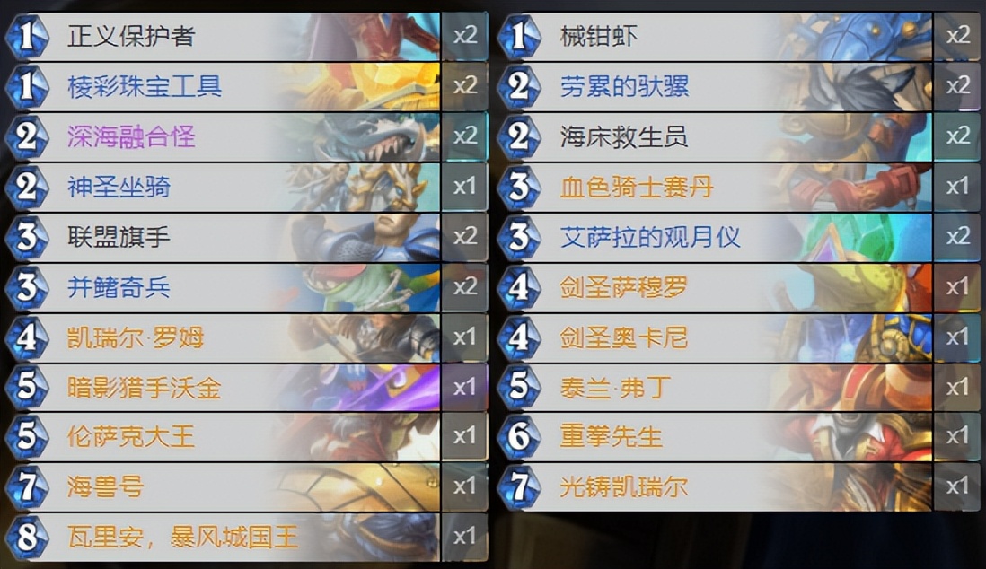 这套卡组的缺点是过牌少,但不意味着资源少。深海融合怪就是前期极为优质的过渡神器,械钳虾能够让深海融合怪吃到BUFF不说,现在骑士的随从池子也很优秀,有机械、纳迦、龙.....总是能给我们一点意外之喜。还有劳累的驮骡,正义保护者,这些卡不一定要贪BUFF,直接打下稳住场面就行。前期留牌除了光铸凯瑞尔一定要留之外,其余可以按照费用来,我们的费用曲线还是比较平缓的,只要牌留好了就不会出现断层的情况。
