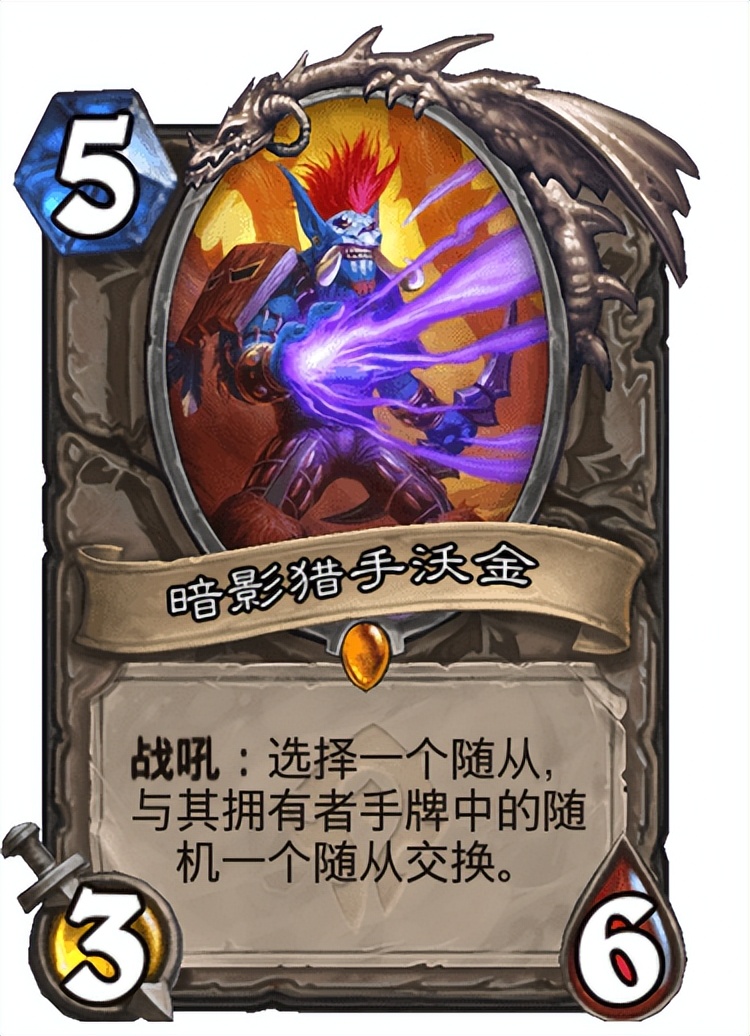 暗影猎手沃金和剑圣奥卡尼都是可以被替换的橙卡,比如替换成穆坦努斯。我更喜欢沃金一点,沃金和穆坦努斯的不同在于穆坦努斯更针对核心卡,如果对手没有特别重要的核心,那么交换其随从后,不仅能浪费对手的战吼效果,还能迫使对手重新花费用打。