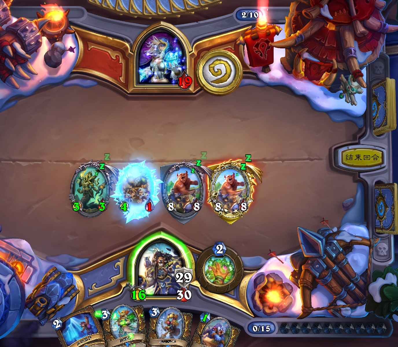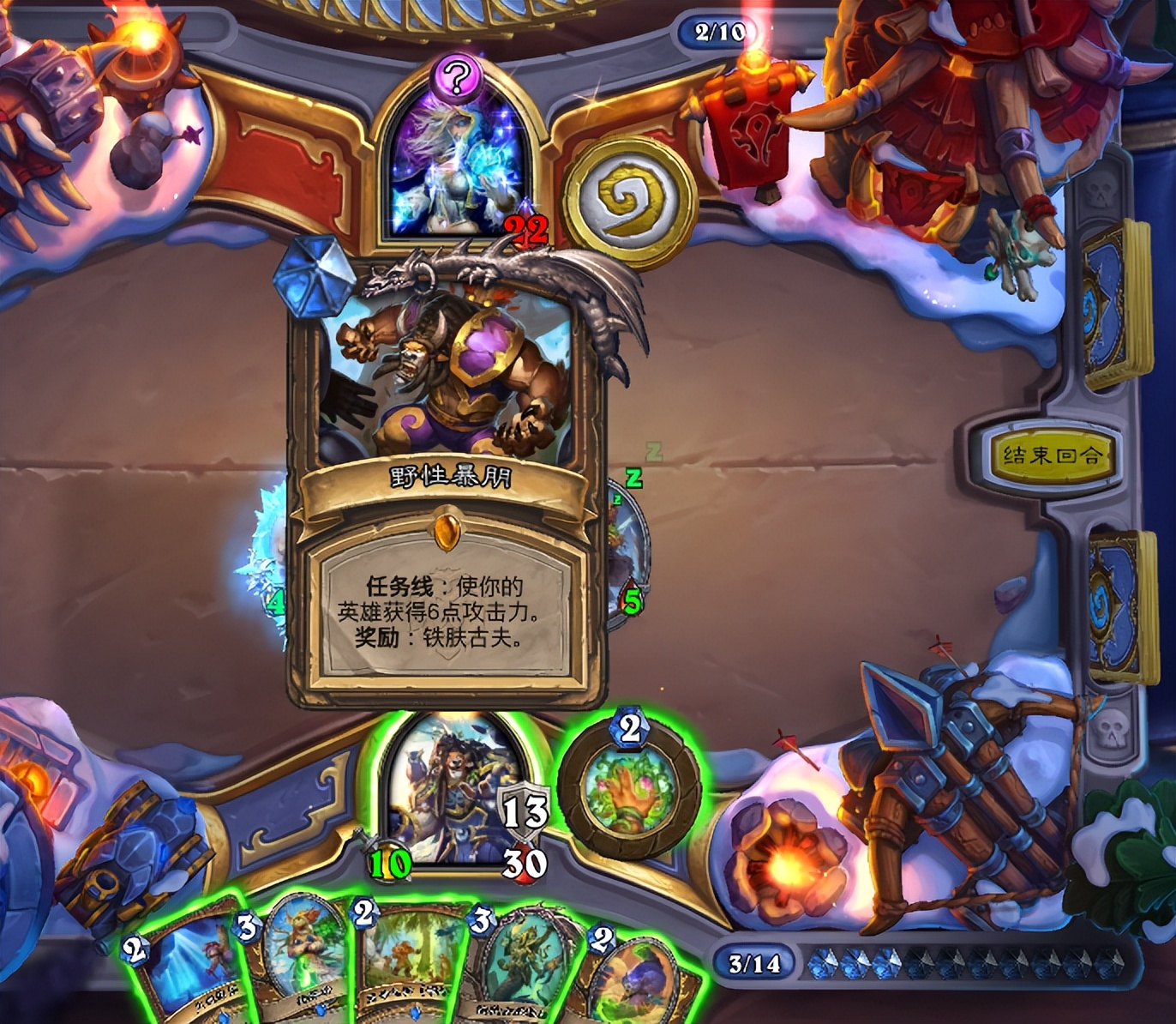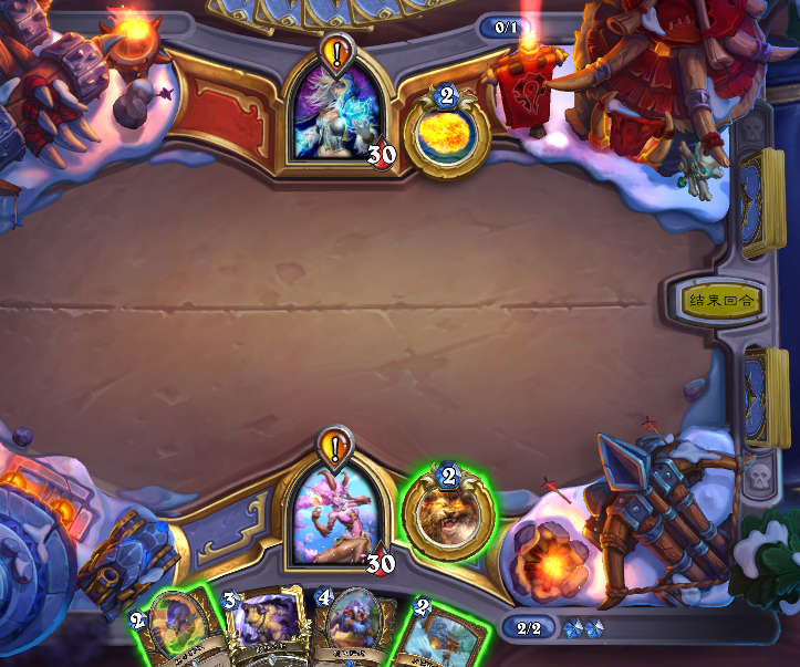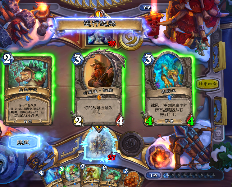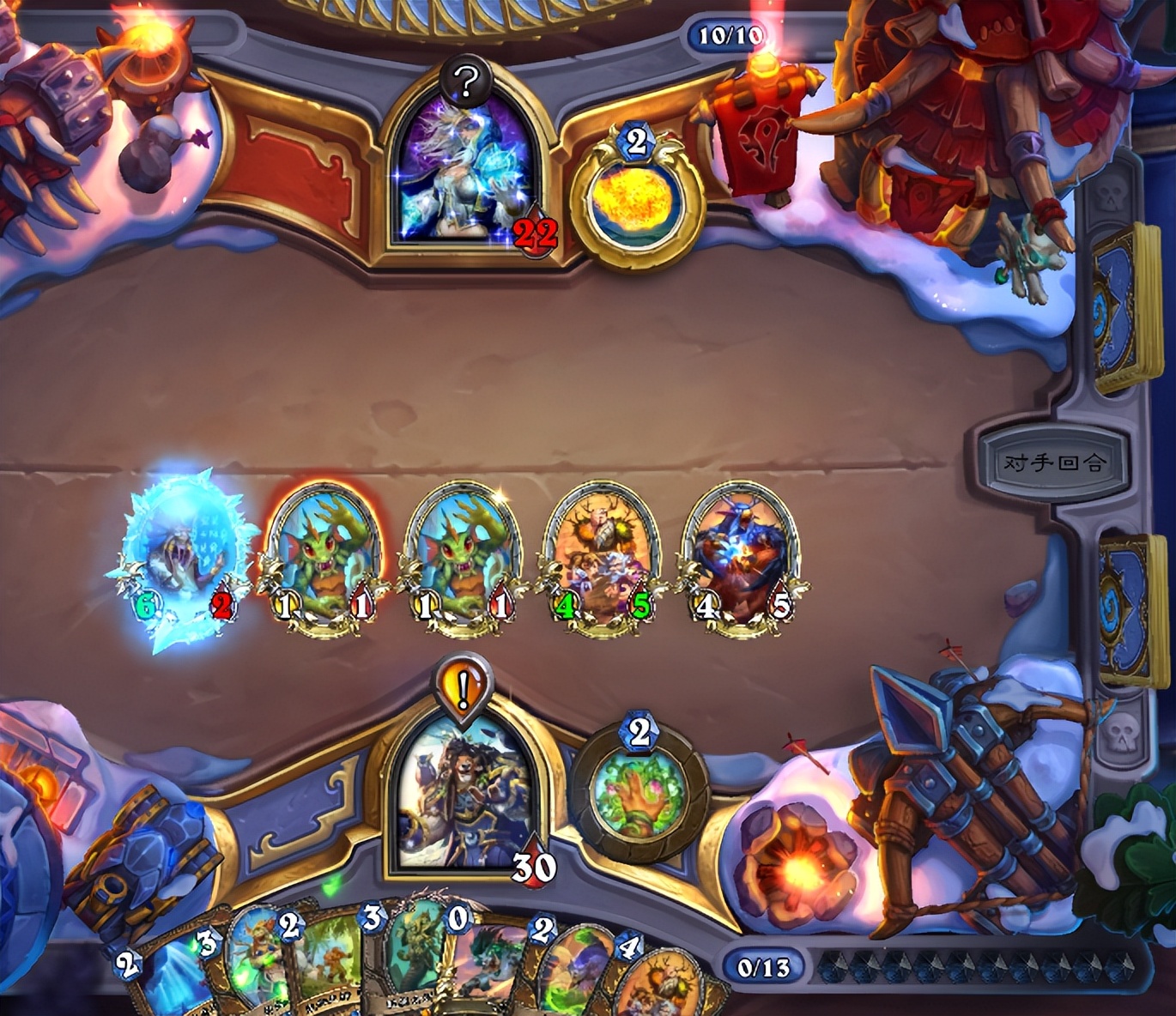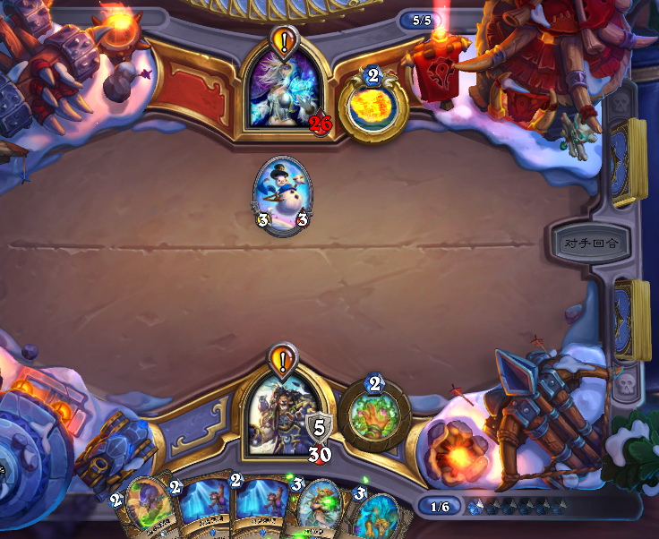 这把我起手还行,开局三费跳了野性之怒之后准备继续展开,但是对面也是个高分老法师,直接雪人封路,每回合我做场他就用法术解掉,雪人稳定怼脸封我英雄攻击,让我还是比较难受的。