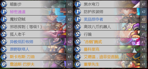 这套盗贼是当前版本中最为热门的卡组,作为炉石传说中的大热门职业,盗贼经过了新卡补强之后有了非常显著的提升,尤其是之前一直缺少的斩杀能力因为重拳先生的上线有了极大程度上的改观。