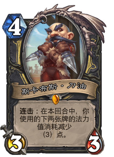 高效八爪机器人以及斯卡布斯·刀油这两张卡是整套卡组的核心,尤其是高效八爪机器人,在手牌即将达到阈值且核心牌上手之后,我们可以拍下高效八爪机器人来使用,配合防护改装师甚至是奖品掠夺者来触发高效八爪机器人的效果。毕竟这张卡拍下来之后,一般对手都不会任由你去减费的。而斯卡布斯刀油主要是享受高效八爪机器人的减费红利,之后通过连击效果去减费卡组中的大核心来使用的卡牌。玩的时候千万注意不要打完刀油再上暗影步打出这种操作,不然下一个逗鱼时刻必然有你。