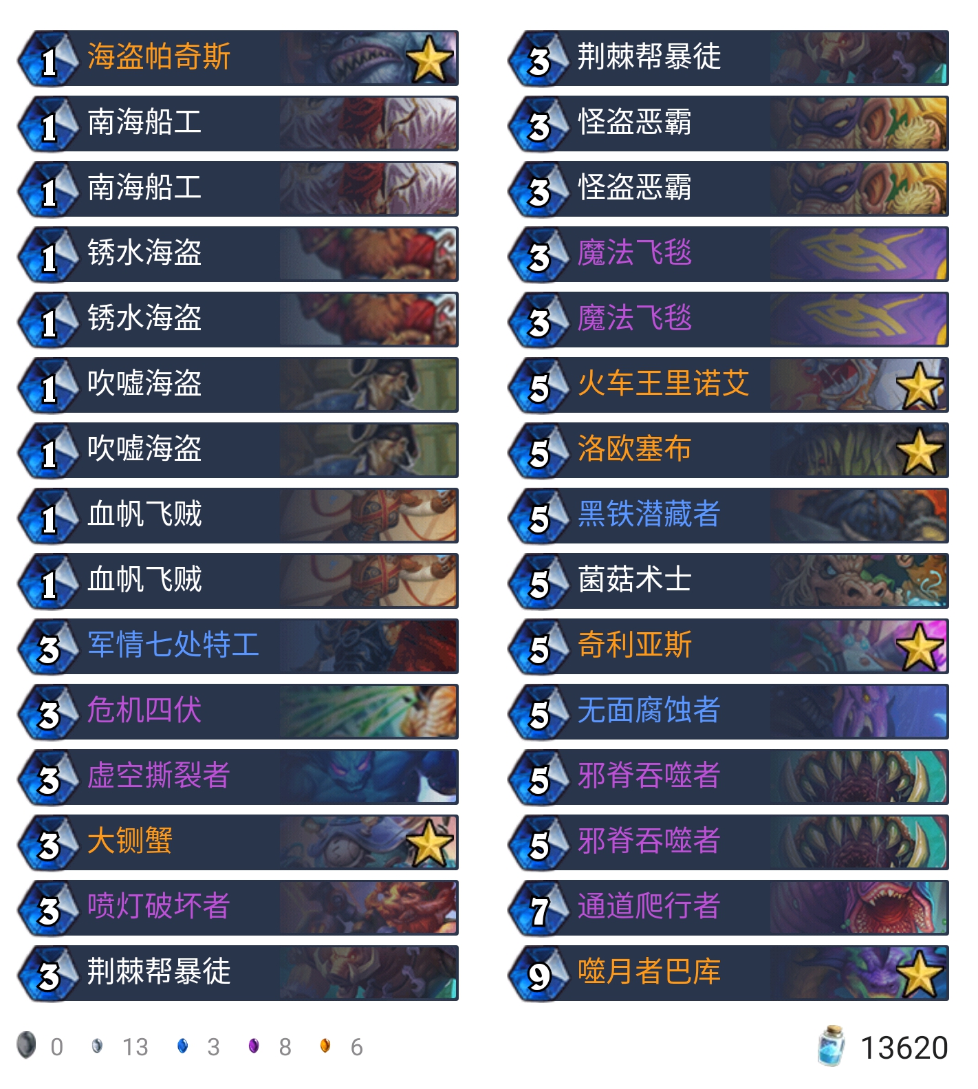 在我看来,奇数贼在快攻中是一套比较吃操作的卡组,一些细节可能往往就能决定胜负,当然因为怪盗恶霸给的跟班以及吹嘘海盗,我也无数次在绝境中翻过盘。