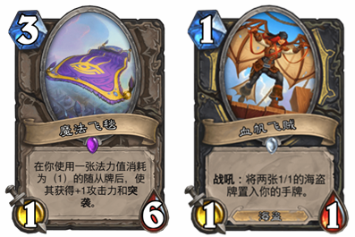 在对手的英雄技能有打1的情况下(德鲁伊,法师,盗贼,DH)我们可以保留111血帆海贼和111吹嘘海盗,让锈水和南海在四费或者六费配合恶霸和刺杀花打出,当然这些是基础中的基础,我要说的当然不止这些。