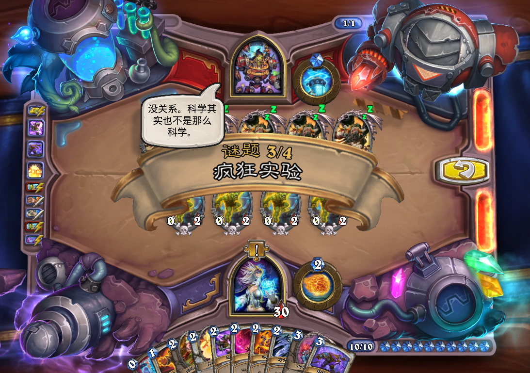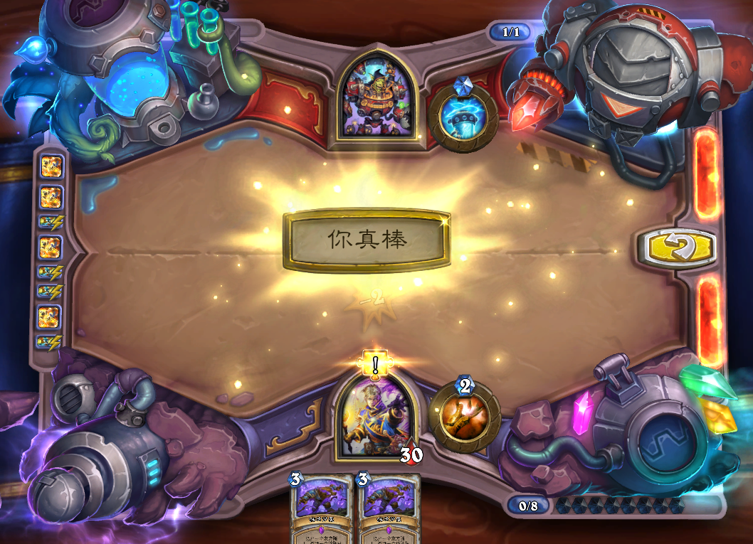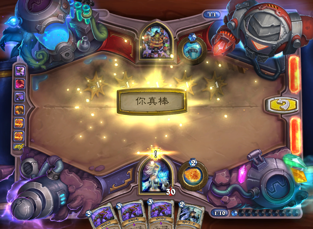 第三步,此时手上4个惩击,用惩击清掉乙方场上4个随从,最后杀光照元素。(用痛配合实验体启动效果一样)