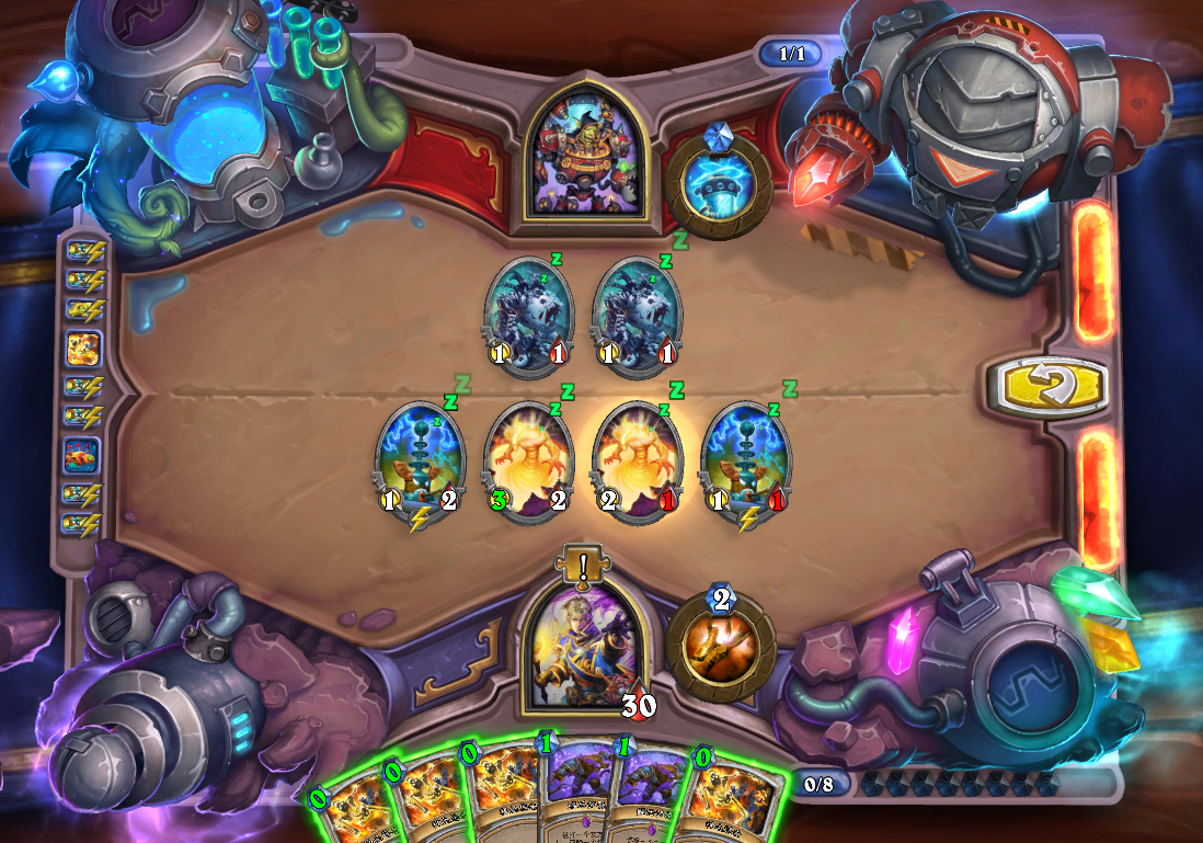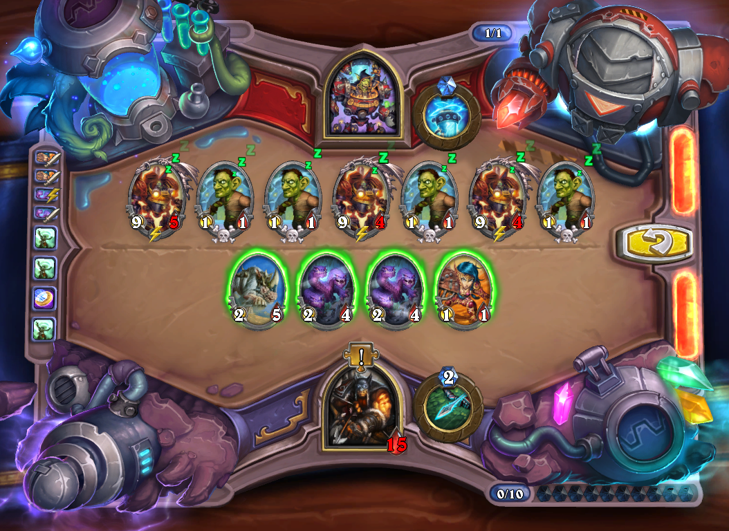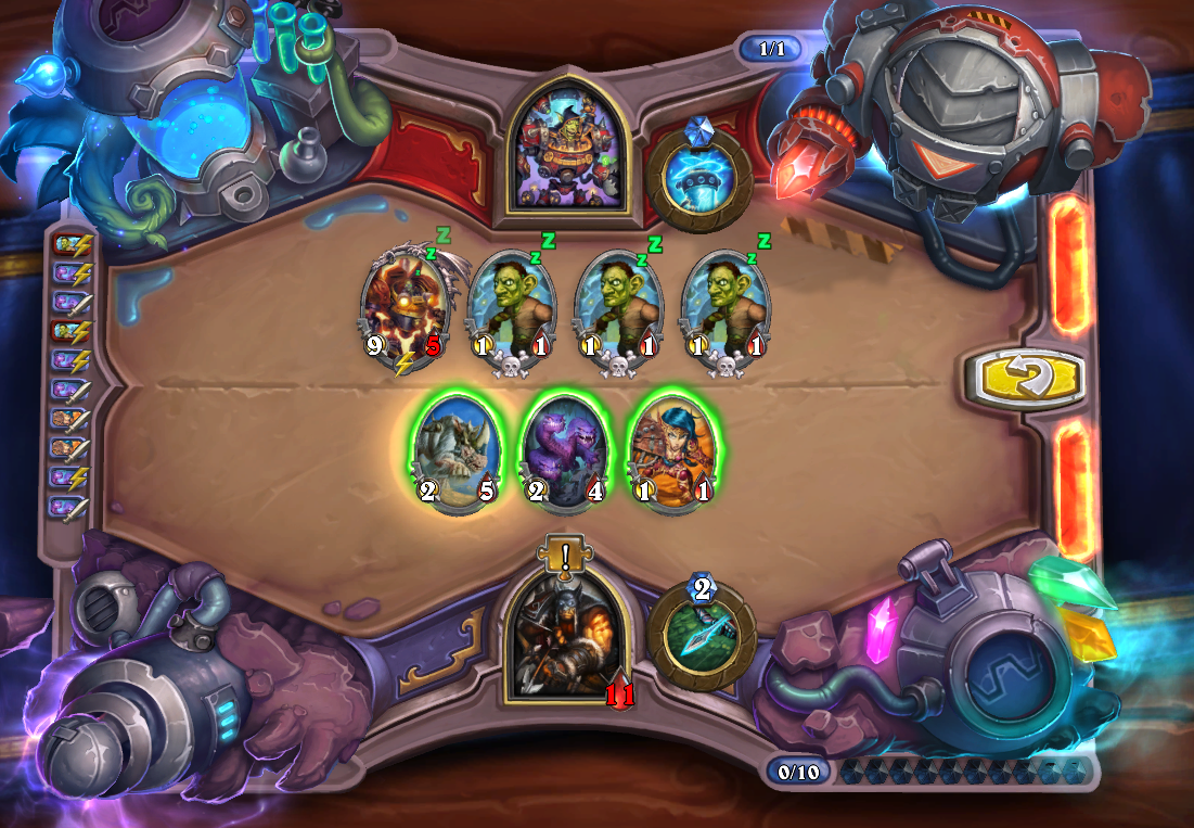 第一步,上犀牛,3个多头蛇分别贴上风怒。其中一个多头蛇攻击中间的瑟玛普拉格,两个工程师学徒攻击中间和最右边的瑟玛普拉格。此时场上3个瑟玛普拉格和4个麻风侏儒。