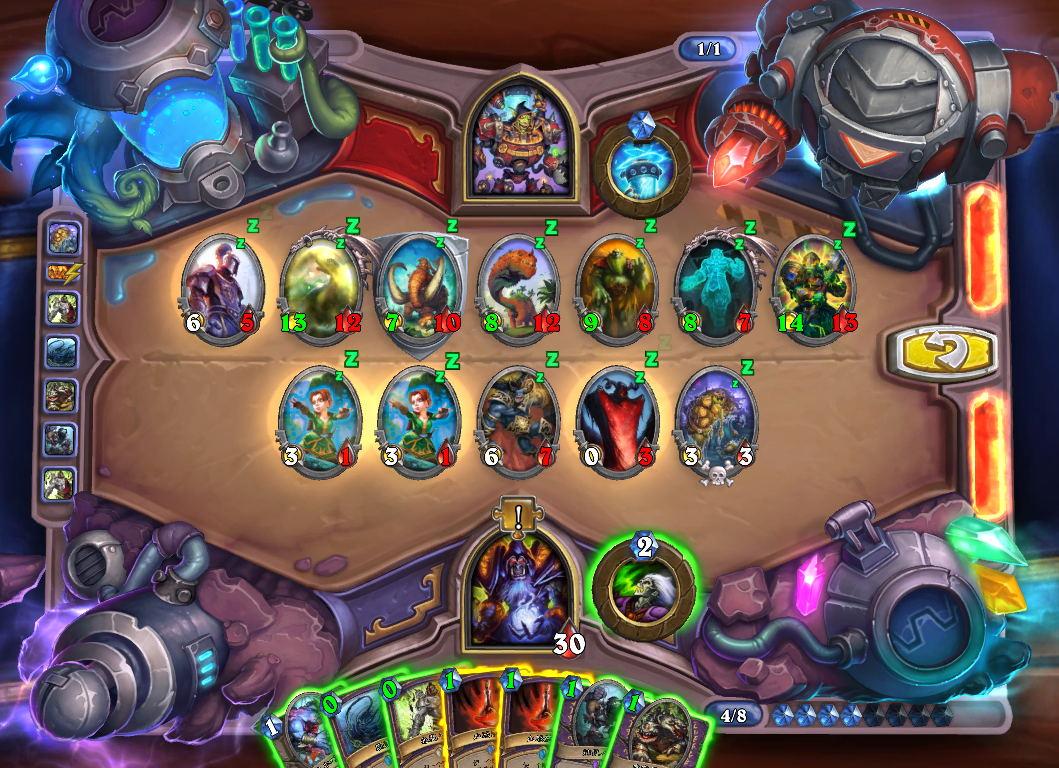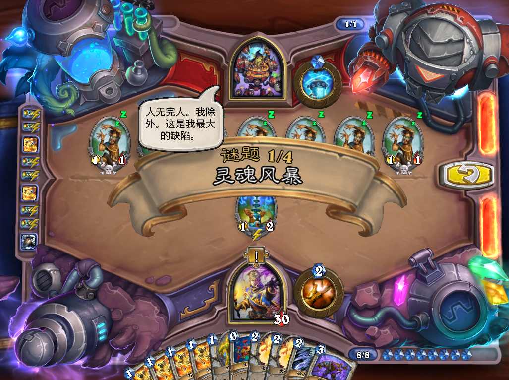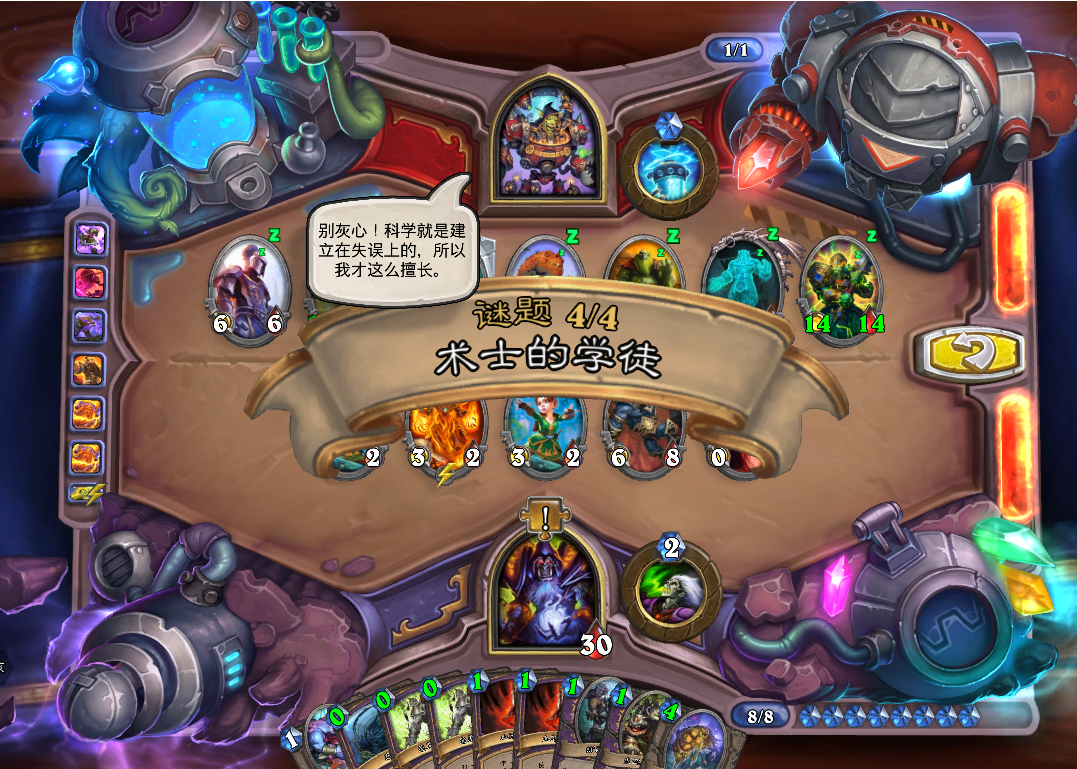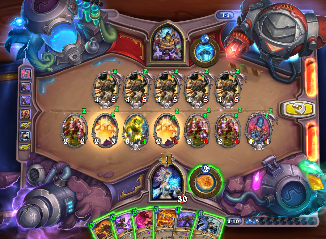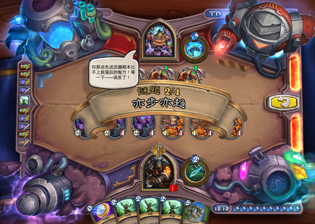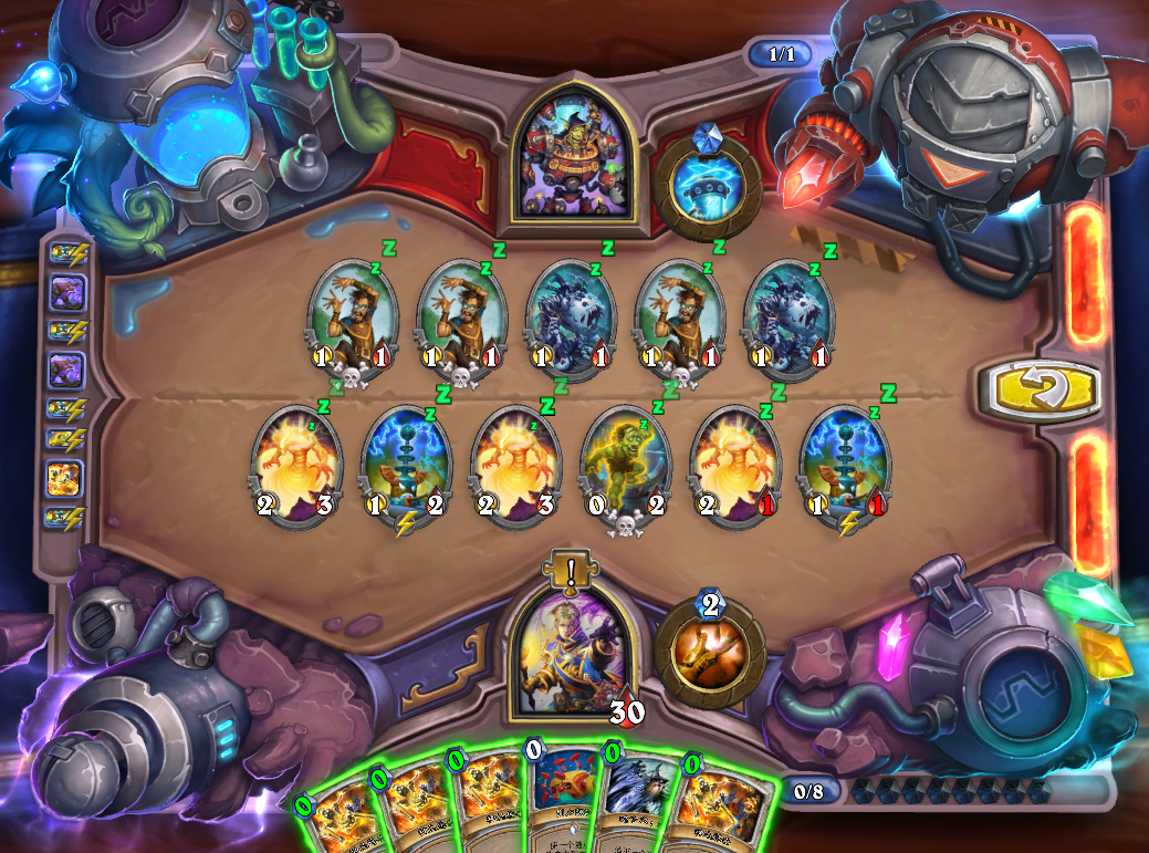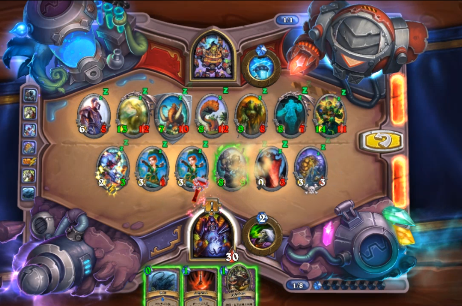 第二步,上奥数畸体,恶魔之火打青玉魔像。捕鼠人吃掉恐怖末日守卫,血怒药水贴给任意随从给奥数畸体加生命值。