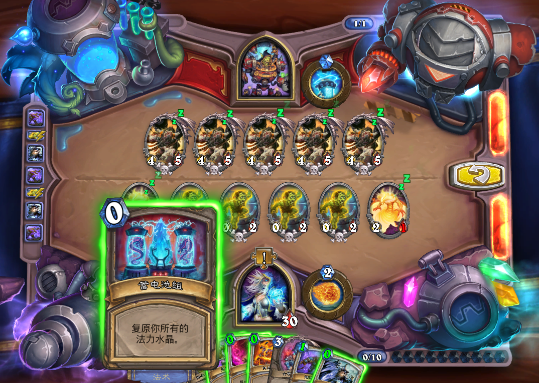 第一步,首先上光照元素,鲜活梦魇复制左侧第一个实验体,痛掉复制体。然后鲜活梦魇继续复制左侧第一个实验体,痛掉实验体。最后鲜活梦魇复制光照元素,此时10费正好用光,使用蓄电池组恢复法力水晶。