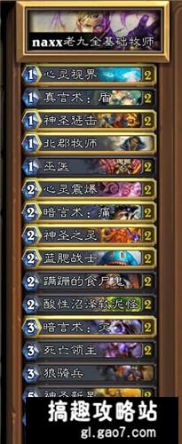 由于boss的腐蚀术的存在,翻倍心火光明泉,在憎恶与食尸鬼的帮助下,显得十分无力。所以楼主放弃了这个思路。改用偷牌牧。核心思路是,帮助对面产生鬼灵仆从,减少己方鬼灵仆从的产生。130,暗影狂乱,思维窃取,心灵视界,就是这个思路下的产物。阿古斯防御者是借鉴boss日怒保卫者的思路,给己方不得已产生的鬼灵仆从架嘲讽,让对手必须杀死。
