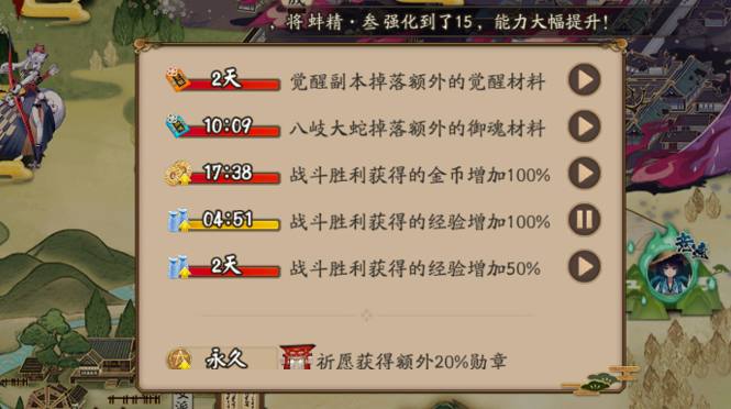 首先,一定要注意好开关经验加成,这个经验加成可以通过各种各样的活动、礼包、宠物获得,其实获取起来没那么麻烦,实在不行就买一个很便宜的新手礼包,里面有一个7天的50%经验加成,当然是一天发24小时的,一周发完,只要控制好开关,不浪费,基本上从三四十级升到满级你都用不完,刷御魂、觉醒、探索时尽量要开着,对阴阳师经验加成很丰厚!