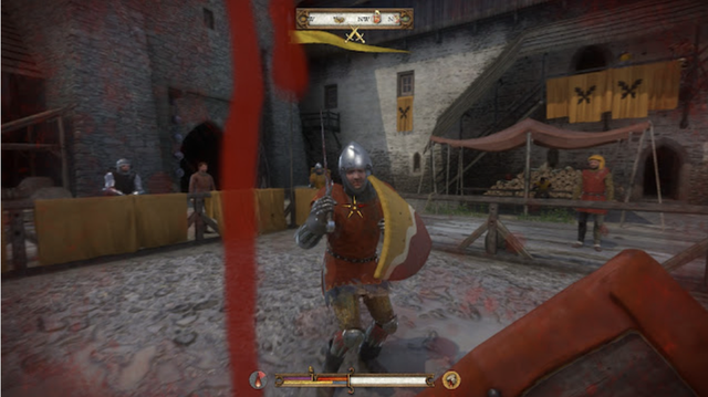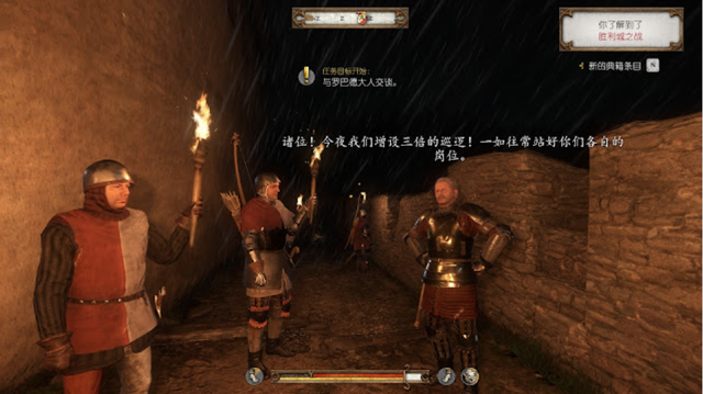 假如你在战斗中不幸受伤,系统会判断你是哪个部位受到重创,假如你是头部流血,那么屏幕会不断流出鲜血,随着时间经过,视野会逐渐模糊,严重影响到战斗过程;假如你是腿部受伤,轻微受伤会无法奔跑,重伤将让你暂时残疾,只能站在原地任人挨打。要如何避免在与敌人搏斗中受伤,除了尽可能少被敌人击中外,另一种方法是身上的防具穿越厚越好。《天国:拯救》防具系统有别于其他游戏,仅仅是提供各项防御数值,减少外来的伤害,重甲能有效地减免伤害,敌人的刀刃会较难刺穿护甲,自然就不会伤到肉体,举起盾牌更能抵挡几乎所有的外来伤害,不过全副武装上战场也有缺点,那就是你的行动会变缓慢,挥舞武器和格挡伤害都会消耗大量体力,很容易因为体力耗尽惨遭敌人一波带走。