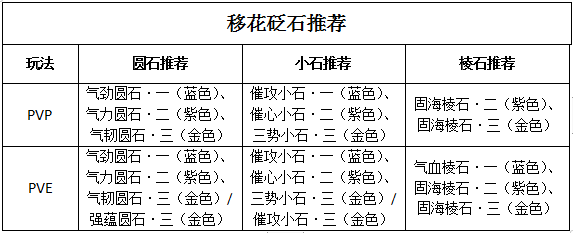 在PVE中由于队伍中有天香存在,移花在不切辅助的情况下,砭石方面可以不用关注气血和抗性的加成,尽量优先攻击和气劲去堆叠伤害,圆石方面推荐使用【气劲圆石·一】和【气力圆石·二】