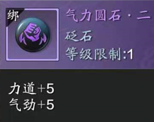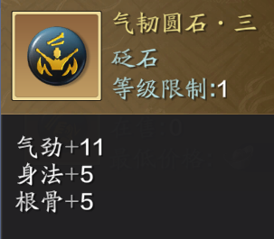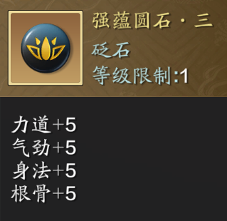 金色圆石中依然优先使用【气韧圆石·三】,想在面对BOSS时增加爆发能力可以使用【强蕴圆石·三】,同时力道和气劲,保证暗伤加成的同时均衡会心,提高瞬间的伤害。