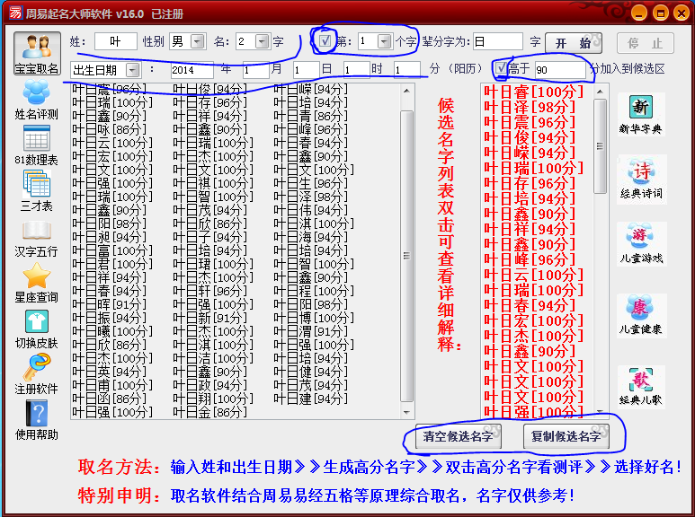 我们在上栏填好一些资料后就可以点“开始”,姓名就有很多名字蹭蹭地出来了,出来的名字还带打分的哦,100分是最好的了。这些都是可以设置筛选多少分数的。