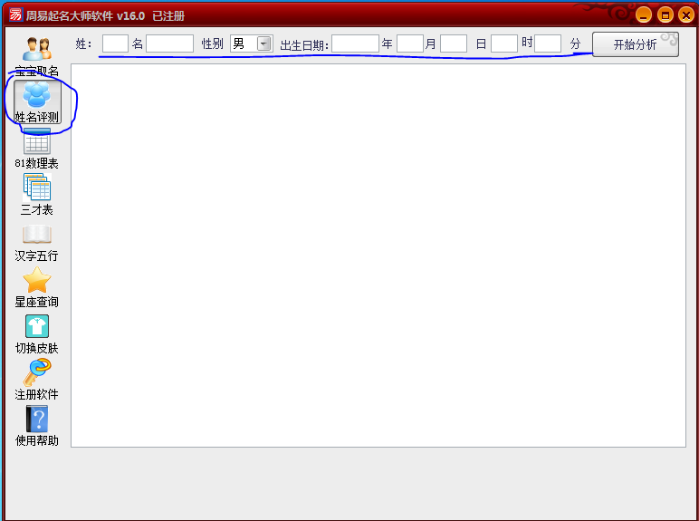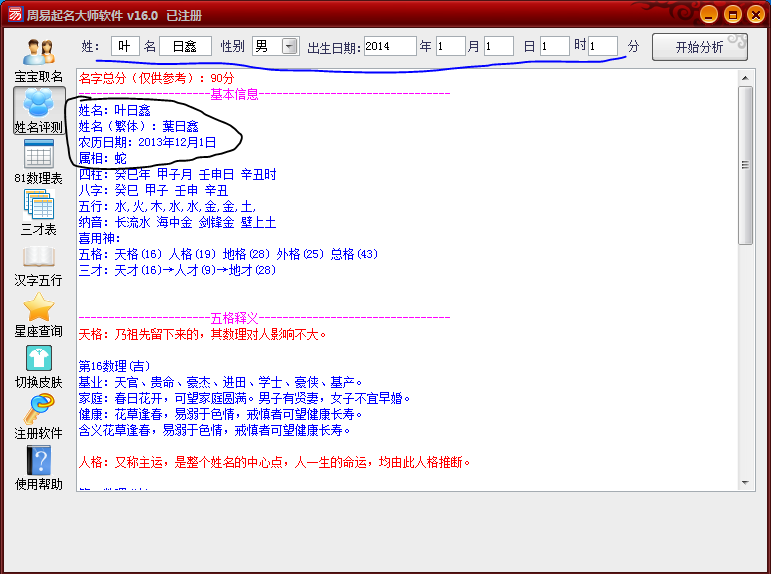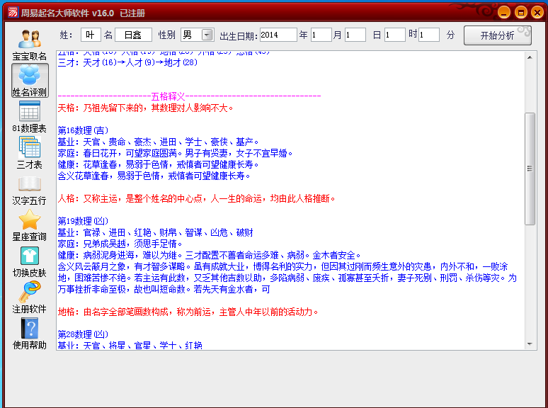 这个功能评测姓名了,我们大人的名字也可以评测的哦,在上面填好资料后,点击“开始分析”下面就出来结果。