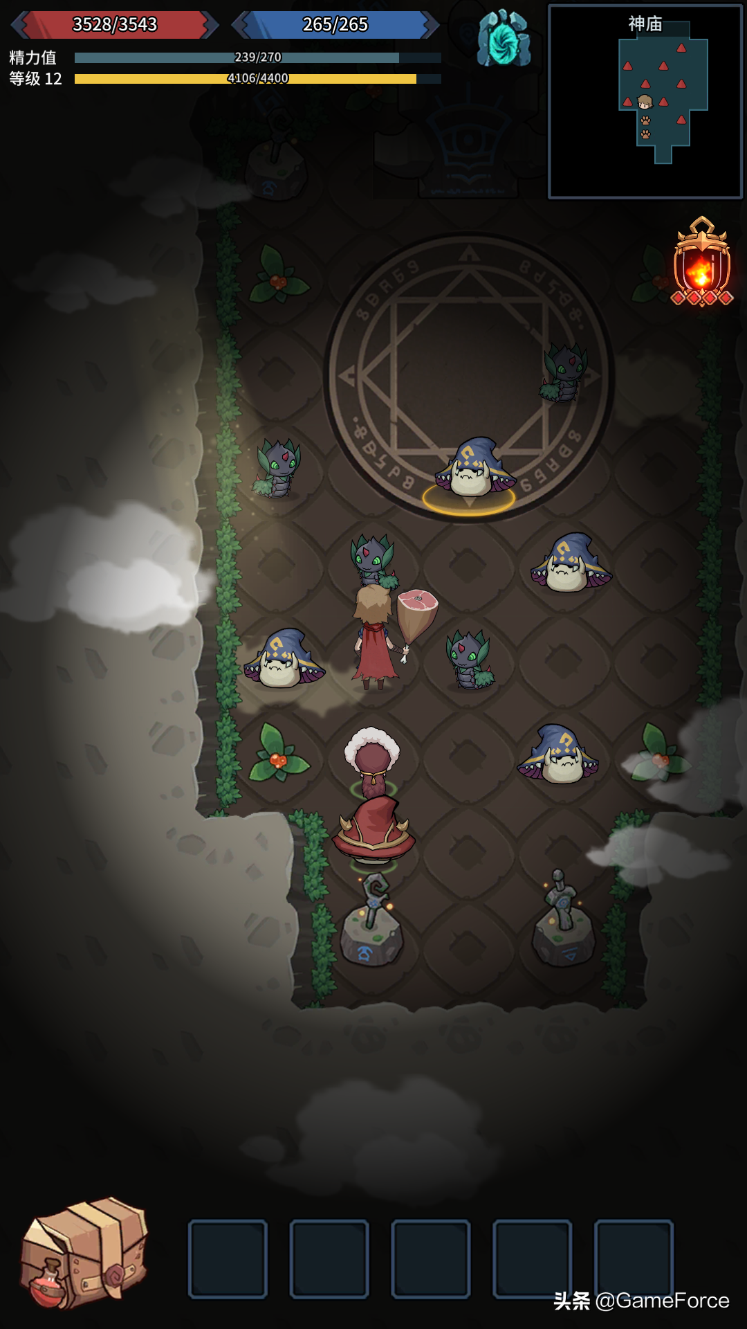 玩家在地下城中,可以清楚看到地图上的宝物、神庙、楼梯等元素,宝物只要走上去就可以自动拾取,但要注意自身背包容量限制,装满的话可以分解一些没啥用的东西来腾出空间;神庙相当于地图中单独的房间,里面可能有丰厚的宝物,也可能是大批敌人,考验你的人品;楼梯则是通往下一层的入口,一旦下去就不能返回上一层了