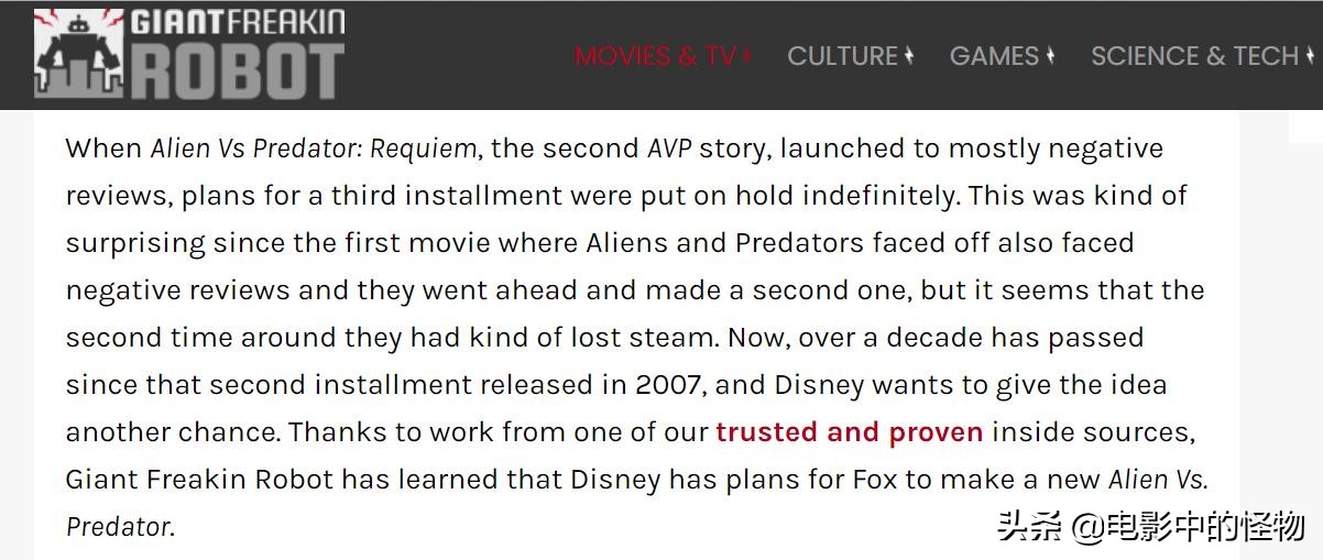 GIANT FREAKIN ROBOT总是会有这样那样的独家报道,有一些是捕风捉影,但是就像这一类的网站一样,有时候也的确是真的消息。值得注意的一点,《异形大战铁血战士》系列已经多年没有被提及了,突然会有这样的爆料,一般情况下不会是空穴来风。