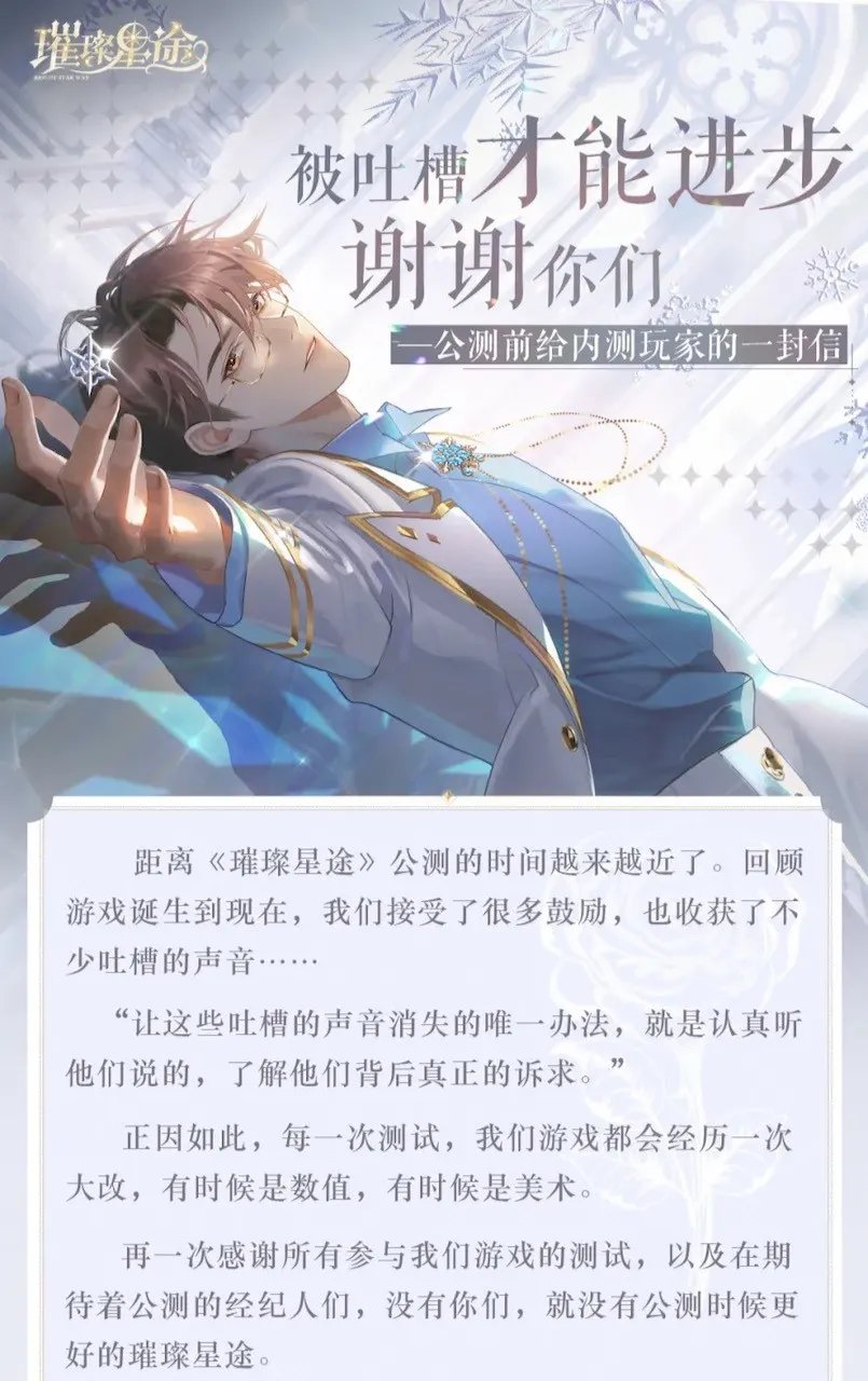 经历数轮测试打磨,1月13日,由畅游聚变工作室研发、腾讯游戏发行的女性向手游《璀璨星途》正式公测,与喜爱它的玩家见面。