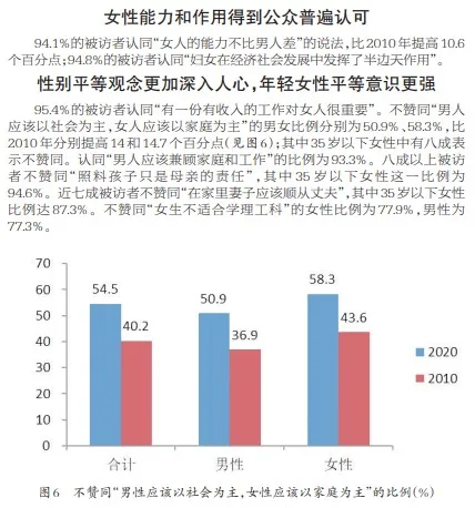 全国妇联和国家统计局组织的第四期中国妇女社会地位调查显示,2021年性别平等观念已经深入人心,且年轻女性平等意识更强,有95.4%的被访者认同“有一份有收入的工作对女人很重要”。与此同时,有10.3%的未婚女性拥有自己的名下房产,比例相较10年前提升了3.4个百分点。