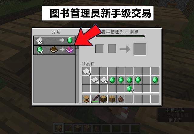 新手级的图书管理员第二层会出现两种交易:第一种是以“9颗绿宝石换1个书架”;第二种是以“绿宝石+书,换一本附魔书”,这其中就包括了“经验修补”。附魔书越罕见等级越高,需要的绿宝石数量就越高。