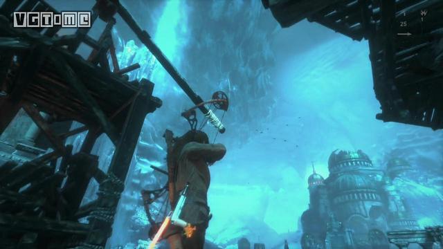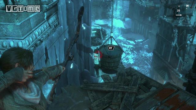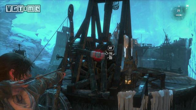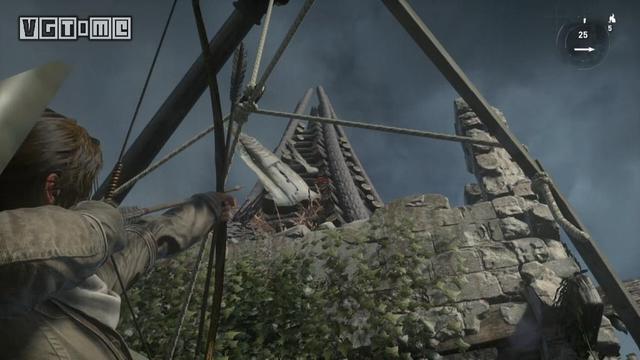 好搭档约拿被圣三一抓走,劳拉决定对其施救。过场动画过后,在营地旁可入手通过必备道具宽头攀爬箭矢,将其射入软木表面就能往上爬了。有时当目的地比较高时,可能需要射入2-3根攀爬箭矢才能抵达。
