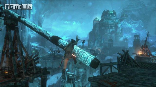 然后前往第二台投石器,清除杂兵之后开始解谜,清除投石器齿轮的冰冻。先转动杠杆将重物对准冰冻,然后跳到杠杆上跑到另一边的平台上,使用绳索箭连接杠杆与水桶。转动杠杆用水桶接满冰川融水后使用绳索箭打开水桶的阀门,在水桶防水的过程中跳到另一边的重物上打碎冰冻。