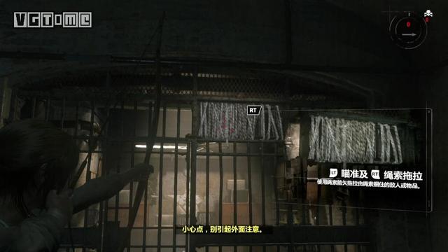 通过一扇铁门后又是一场激烈战斗,高处的敌人火力比较强,不过对付他们其实很轻松,用弓射出绳索拉断平台的支柱就能将他们一网打尽。之后会出现几个装备比较好的敌人,可以用破片手榴弹先让他们失去行动能力再轻松射杀。