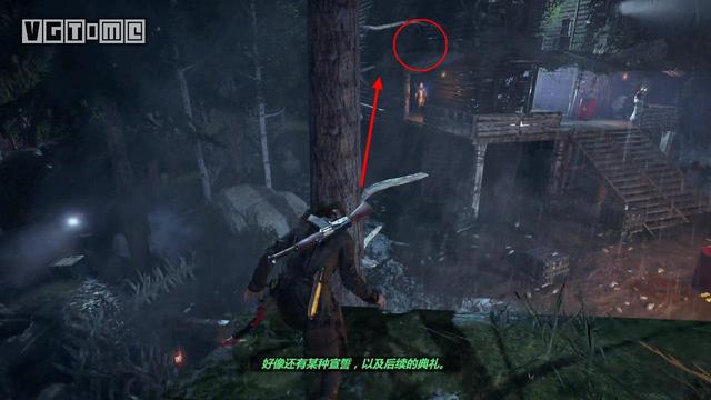 第三个区域,先爬上初始位置左侧的树在通过丢掷钩斧,可以直接来到小屋的小窗处。