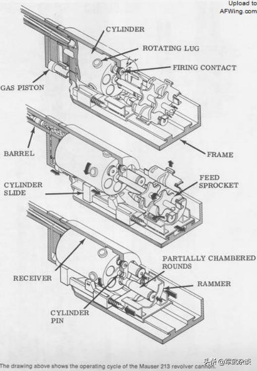 在战争后期,德国航空部要求开发出一款初速1000米每秒,射速1000发每分钟的20毫米航空机炮,这已经大大超出了传统20毫米航空机炮的性能。因此,毛瑟公司决定设计一款转膛航空机炮,通过将航炮闭锁系统的线性运动转化为旋转运动来提升航炮射速,最终成果就是MG213C型20毫米航空机炮。