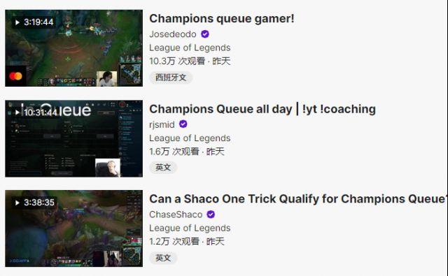 如果你在图奇直播平台上输入Champions queue,会看到很多相关的直播间,对于那些想看职业选手第一时间的观众,或者想学习更多高分段游戏技巧的玩家,这是一个不错的选择。几年前的峡谷之巅让国服高分段直播重新流行起来,现在,Champions queue也成功拯救了一波外服直播的人气。