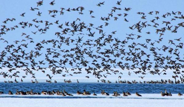在天然百湖之城大庆,鹤鸣湖湿地温泉风景区是春季观鸟的好去处,可观赏鸟类有野鸭、鹤、白鹭等。3万亩湿地草原、水域湖泊以及郁郁葱葱的草甸中,肥美的鱼虾和藏在软泥中的草根,养育了上百种水禽,成为了独具特色的“鸟类天堂”。