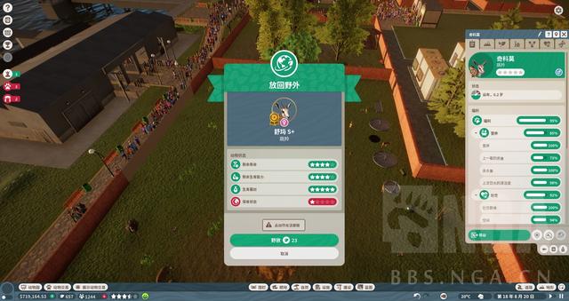 在福利中社交和栖地的设定上就能体现本作游戏内容深度,为了把更真实的动物园体验玩家带给玩家。动物系统完全参照了现实中动物的一些生活习性,玩家需要根据百科中的栖地信息等来设计栖地面积、选择围栏,据此满足动物们的福利需求,据以动物福利来衡量玩家饲养动物的好坏,下分了营养、社交、栖地、丰富化四大项。营养和栖地就是动物的吃和住,社交就是该物种种群数量是否合理,丰富化就是动物的一些课外娱乐。