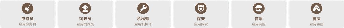 庶务员(保洁员)负责清理园区垃圾,饲养员负责栖地的清洁和动物喂食,兽医负责治疗动物伤病和研究动物所喜好的丰富化项目,工程师则负责维修栖地的围栏和维修设施研究。
