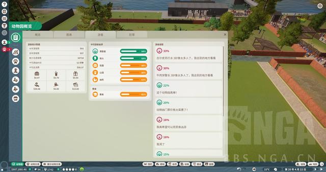在本作中弱化了游客的群体属性,在动物园的游客分析中也只会体现一些基础的游客统计,平均游客需求和游戏感想。在游客满意度方面,玩家所需注意的经营分析数据越来越少。