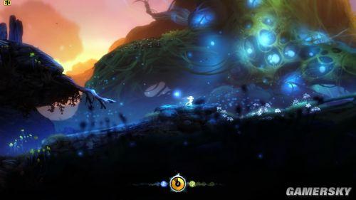 《奥日与黑暗森林》的开场十分精彩,也许是今年到目前我见到最震撼的游戏开场,甚至一度眼泪都要留下来。正如游戏制作人在采访中所说的那样,他们从迪士尼和宫崎骏的动画电影里获得了些许灵感。游戏的开场就像《狮子王》或者《人猿泰山》再加上点儿《幽灵公主》或《龙猫》的感觉;总之它既有美式动画的野性神秘,也有日式动画的细腻感人。艺术设计同样相当精美,颜色大胆华丽又不失细节,完全达到了电影级水准。再配合年轻作曲家Gareth Coker倾力打造的New Age音乐,女歌手Aeralie Brighton清丽委婉的嗓音,更称得上点睛之笔。(原声点此下载)